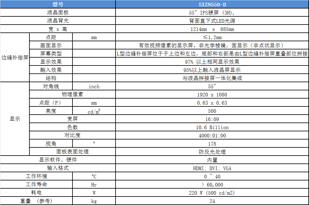 無縫液晶拼接屏SXZN550-D技術參數表: